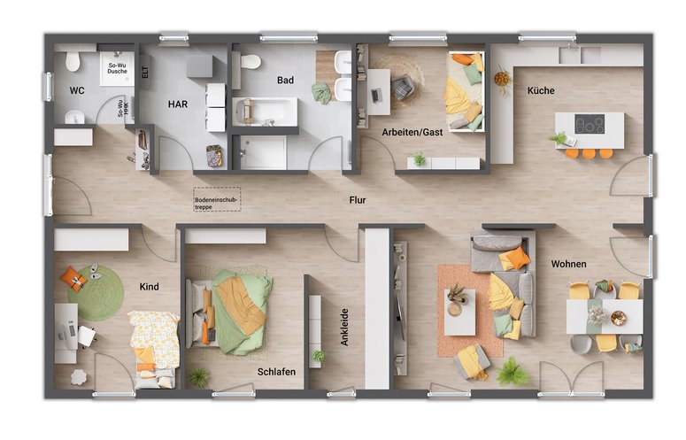 Familienleben auf einer Ebene - Der Bungalow 131 hat es in sich – 5 Zimmer, zwei Kinderzimmer und zwei Bäder – viel Wohnfläche und clever nutzbarer Stauraum für die ganze Familie. Die kluge Raumaufteilung bietet eine große Wohnküche in der Sie mit ihren Lieben Freizeit und Essen genießen können. Das traumhafte Wohnzimmer mit seinen großen Fenstern ist der perfekte Ort zum Entspannen, bietet freien Blick in Ihren Garten und mit wenigen Schritten sind Sie auf Ihrer Terrasse im Grünen.