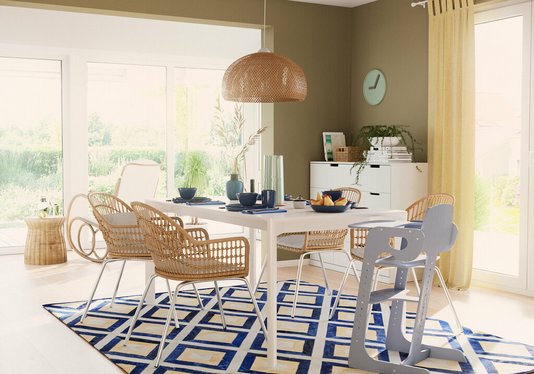 Der meist lichtdurchflutete Wintergarten bietet ein schönes Ambiente für einen Essbereich. Im Mittelpunkt des neu geschaffenen Raumes steht dann ein Tisch mit Stühlen. Freiraum rund um den Tisch setzt diesen Ort der Zusammenkunft erst richtig in Szene. Eine große Familie kann von einem eigenen Esszimmer gleich mehrfach profitieren. So lässt sich der Tisch natürlich nicht nur zum Essen nutzen, sondern auch für gemeinsame Spieleabende, zum Basteln, Hausaufgaben machen oder als temporäres Homeoffice. Eine Grünpflanze hier und da reicht als Dekoration vollkommen aus, denn die Nutzung allein wird den Raum schon mit Farben und Lebensfreude erfüllen.